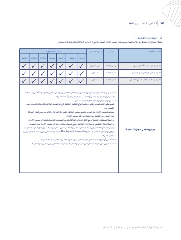 58 2023أع�ساء اللجنة املن�سب ت�سنيف الع�سو اجتماعات اللجنة1/ 2023 2/ 2023 3/ 2023 4/2023 5/ 2023 6/ 2023 7/ 2023ال�سيد/ عيد عبد اهلل الر�سيدي رئي�س اللجنة غري تنفيذىال�سيد/ علي عبدالرحمن ال�سايع ع�سو اللجنة م�ستقلال�سيد/ حممد خالد عثمان العثمان ع�سو اللجنة م�ستقلمهام وملخ�س اجنازات اللجنة2 - جلنة إدارة املخاطر : تت�سكل جلنة إدارة املخاطر من ثالث أع�ساء مبوجب قرار جمل�س االدارة ال�سادر بتاريخ 31 مار�س 2022 وذلك ملدة ثالث �سنوات - إعداد ومراجعة ا�سرتاتيجيات ومنهجية عمل وحدة إدارة املخاطر ورفعها إلى جمل�س اإلإدارة، والتأكد من تنفيذ هذه اإلإ�سرتاتيجيات وال�سيا�سات، وأنها تتنا�سب مع طبيعة وحجم أن�سطة ال�سركة.- �سمان توافر املوارد والنظم الكافية إلإدارة املخاطر.- تقييم نظم وآليات حتديد وقيا�س ومتابعة أنواع املخاطر املختلفة التي قد تتعر�س لها ال�سركة، وذلك لتحديد أوجه الق�سور بها.- م�ساعدة جمل�س اإلإدارة على حتديد وتقييم م�ستوى املخاطر املقبول يف ال�سركة، والتأكد من عدم جتاوز ال�سركة لهذا امل�ستوى من املخاطر بعد اعتماده من قبل جمل�س اإلإدارة.- مراجعة ال�سفقات والتعامالت مع االطراف ذات العالقة وتقدمي التو�سيات املنا�سبة ب�شأنها الى جمل�س االدارة.- مراجعة الهيكل التنظيمي لوحدة إدارة املخاطر وو�سع تو�سيات ب�شأنه ورفعه إلى جمل�س اإلإدارة حيث أ�سبحت تبعية وحدة إدارة املخاطر إلى جلنة املخاطر مبا�سرة وفقا آلآخر تعديل �سادر من هيئة أ�سواق املال كما ومتت التو�سية بتوكيل مهام إدارة املخاطر لل�سادة Consulting Boubyan للقيام بإعداد تقارير دورية خا�سة بإدارة وتقييم خماطر ال�سركة. - التأكد من أن اجلهة القائمة على إدارة املخاطر لديها الفهم الكامل للمخاطر املحيطة بال�سركة.- إعداد تقارير حول طبيعة املخاطر التي تتعر�س لها ال�سركة، وتقدمي هذه التقارير إلى جمل�س إدارة ال�سركة.