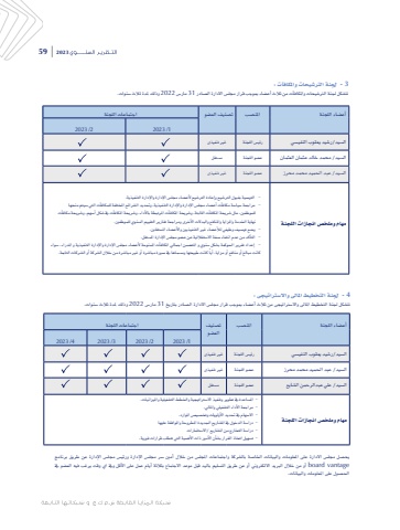 2023 59أع�ساء اللجنة املن�سب ت�سنيف الع�سو اجتماعات اللجنة1 /2023 2 /2023ال�سيد/ر�سيد يعقوب النفي�سي رئي�س اللجنة غري تنفيذىال�سيد/ حممد خالد عثمان العثمان ع�سو اللجنة م�ستقلال�سيد/ عبد احلميد حممد حمرز ع�سو اللجنة غري تنفيذىمهام وملخ�س اجنازات اللجنة3 - جلنة الرت�سيحات واملكافآت : تت�سكل جلنة الرت�سيحات واملكافآت من ثالث أع�ساء مبوجب قرار جمل�س االدارة ال�سادر 31 مار�س 2022 وذلك ملدة ثالث �سنوات.4 - جلنة التخطيط املالى واال�سرتاتيجى : تت�سكل جلنة التخطيط املالى واال�سرتاتيجى من ثالث أع�ساء مبوجب قرار جمل�س االدارة ال�سادر بتاريخ 31 مار�س 2022 وذلك ملدة ثالث �سنوات.يح�سل جمل�س االدارة على املعلومات والبيانات اخلا�سة بال�سركة واجتماعات املجل�س من خالل أمني �سر جمل�س اإلإدارة ورئي�س جمل�س اإلإدارة عن طريق برنامج vantage board أو من خالل الربيد االلكرتوين أو عن طريق الت�سليم باليد قبل موعد االجتماع بثالثة أيام عمل على األأقل ويف اي وقت يرغب فيه الع�سو يف احل�سول على املعلومات والبيانات. - التو�سية بقبول الرت�سيح وإعادة الرت�سيح ألأع�ساء جمل�س اإلإدارة واإلإدارة التنفيذية.- مراجعة �سيا�سة مكافآت أع�ساء جمل�س اإلإدارة واإلإدارة التنفيذية، وحتديد ال�سرائح املختلفة للمكافآت التي �سيتم منحها للموظفني، مثل �سريحة املكافآت الثابتة، و�سريحة املكافآت املرتبطة باألأداء، و�سريحة املكافآت يف �سكل أ�سهم، و�سريحة مكافآت نهاية اخلدمة واملزايا واملنافع والبدالت األأخرى ومراجعة تقارير التقييم ال�سنوي للموظفني.- و�سع تو�سيف وظيفي لألأع�ساء غري التنفيذيني واألأع�ساء امل�ستقلني.- التأكد من عدم انتفاء �سفة اال�ستقاللية عن ع�سو جمل�س اإلإدارة امل�ستقل.- إعداد تقرير احلوكمة ب�سكل �سنوي و املت�سمن اجمايل املكافآت املمنوحة ألأع�ساء جمل�س اإلإدارة واإلإدارة التنفيذية و املدراء، �سواء ً كانت طبيعتها وم�سماها يف �سورة مبا�سرة أو غري مبا�سرة من خالل ال�سركة أو ال�سركات التابعة.كانت مبالغ أو منافع أو مزايا، أيا- امل�ساعدة يف تطوير وتنفيذ اال�سرتاتيجية واخلطط الت�سغيلية وامليزانيات.- مراجعة األأداء الت�سغيلي واملايل.- اال�سهام يف حتديد األأولويات وتخ�سي�س املوارد.- درا�سة الدخول يف امل�ساريع اجلديدة املطروحة واملوافقة عليها- درا�سة التخارج من امل�ساريع /اال�ستثمارات - ت�سهيل اتخاذ القرار ب�شأن األأمور ذات األأهمية التي تتطلب قرارات فورية.ت�سنيف اجتماعات اللجنةالع�سوأع�ساء اللجنة املن�سب1 /2023 2 /2023 3 /2023 4 /2023ال�سيد/ر�سيد يعقوب النفي�سي رئي�س اللجنة غري تنفيذىال�سيد/ عبد احلميد حممد حمرز ع�سو اللجنة غري تنفيذىال�سيد/ علي عبدالرحمن ال�سايع ع�سو اللجنة م�ستقلمهام وملخ�س اجنازات اللجنة