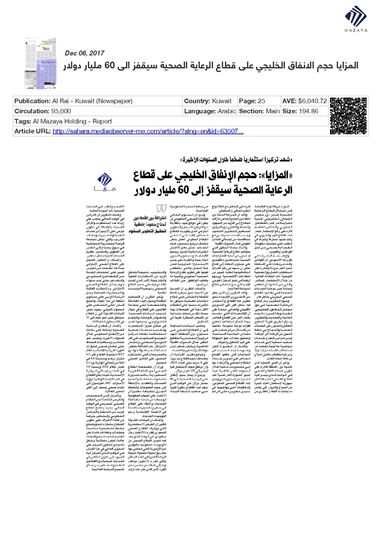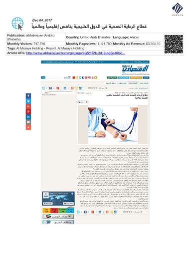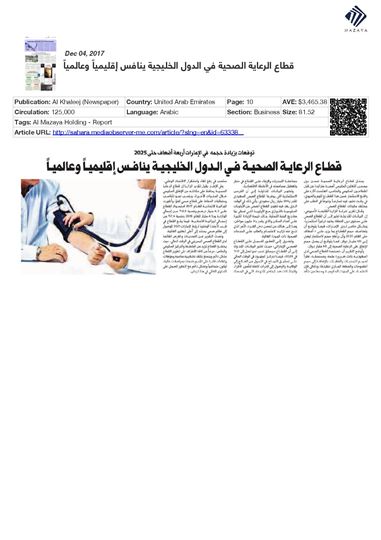وتشير البيانات المتداولة إلى أن القطاع الصحي على مستوى دول المنطقة شهد تركيزاً استثمارياً منقطع النظير خلال السنوات القليلة الماضية، وبشكل خاص لدى دولة الامارات العربية المتحدة، فيما يتوقع أن يتضاعف حجم القطاع بما يزيد عن 4 أضعاف حتى العام 2025 وان يرتفع حجم الاستثمار ليصل إلى 125 مليار دولار. كما يتوقع أن يصل حجم الانفاق على الرعاية الصحية إلى 60 مليار دولار خلال نفس الفترة، يأتي ذلك في الوقت الذي شهد فيه القطاع تطوراً كبيراً على صعيد أنشطة البناء والتشييد نتيجة لتدفق المزيد من الاستثمارات المحلية والخارجية، الأمر الذي احدث نقلة نوعية على حجم القطاع الصحي ونوعية الخدمات المقدمة.