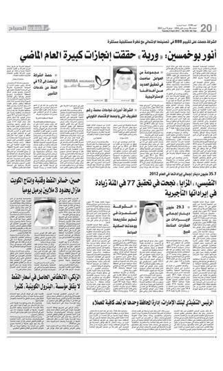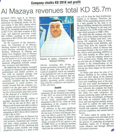 On the occasion of the announcement, the Chairman of Al Mazaya Holding, Mr. Rashid Al Nafisi said in the board meeting, attended by Mr. Fahad Al Ibrahim, Mohmaed Al Othman and Abdul Aziz Alughani, that Al Mazaya Holding succeeded in 2012 in completing the handover of its real estate projects and in meeting a large part of its financial obligations towards companies, investors and individuals.