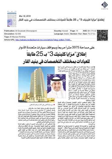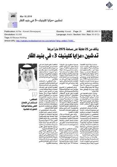 The new healthcare facility is the third medical development of the company after Mazaya Clinic I, known as Clover Centre, and Mazaya Clinic II. Clover Centre is located in Al Jabriya Centre in Kuwait, and Mazaya Clinic II is situated in Sabah Al Salim. Both the medical facilities accommodate a wide array of key global brands and distinctive specialities that are unique to Kuwait and the region.
