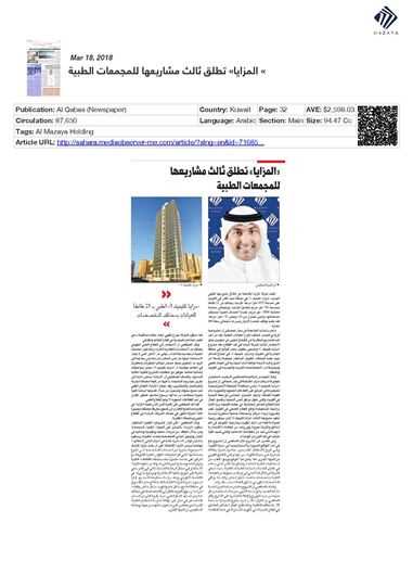 Al Saq'abi added that Al Mazaya has always sought to replicate its previous successful experience in order to provide more value to the company's shareholders and investors. Al Mazaya has nearly a decade of experience in the medical investment sector during which the company has provided unique medical towers that have reinforced Al Mazaya’s position as a key real estate developer in the medical sector, considered one of the most essential platforms in the country.